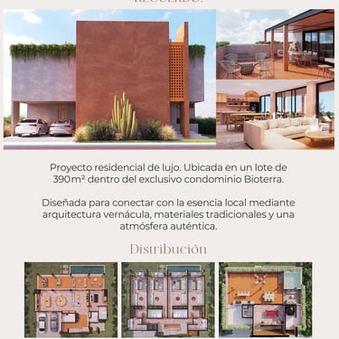 Casa Escondida es un exclusivo proyecto residencial de lujo ubicado en un lote de 390 m² dentro del prestigioso condominio Bioterra, diseñado para quienes buscan un equilibrio perfecto entre confort, privacidad, diseño y conexión con la naturaleza. La propiedad destaca por integrar arquitectura vernácula con materiales tradicionales, creando espacios cálidos, auténticos y atemporales.